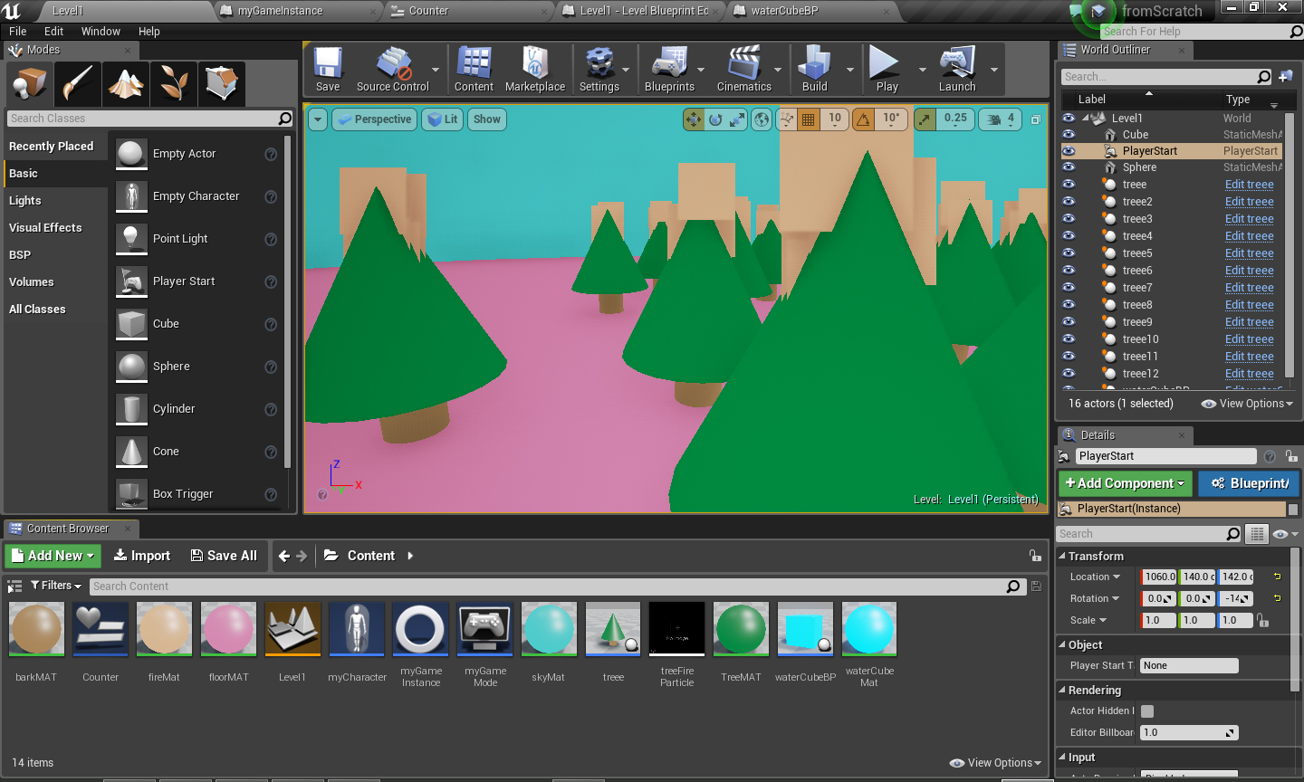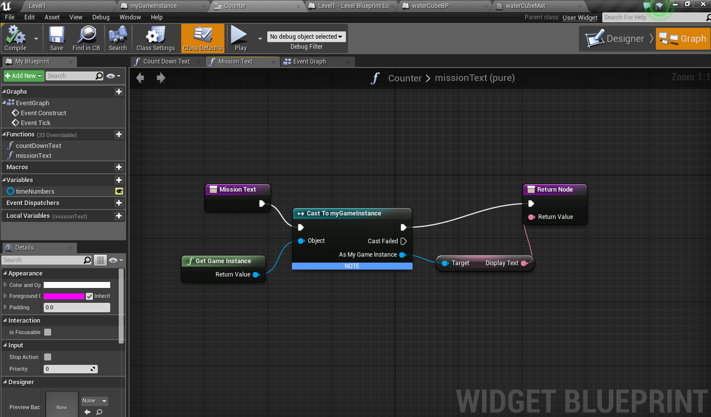 For Sound FX you usually want quick sounds that do not loop. Here I am putting together three jump sounds from freesound.org and putting them through a random node. That way when my player jumps it’s a different sound each time. This could be useful for a lot of things such as an NPC who screams something different each time the player is near, explosions that sound a bit different each time, etc.